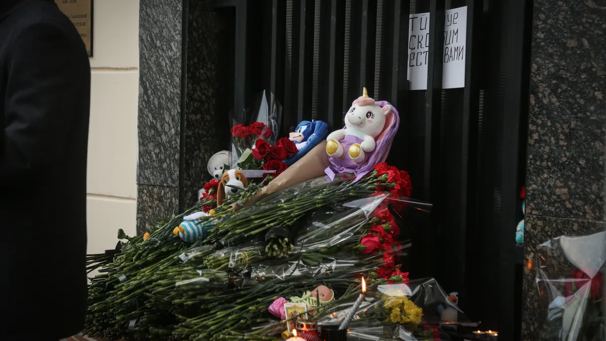 У посольства нет сотрудников полиции, только одна машина, недолго постояв, уезжает. А вот у памятника Лесе Украинке, где в январе образовался стихийный мемориал в знак скорби по погибшим из-за попадания ракеты в дом в Днепре, полиция дежурила круглосуточно. Некоторых людей из числа пришедших возложить цветы даже задержали.