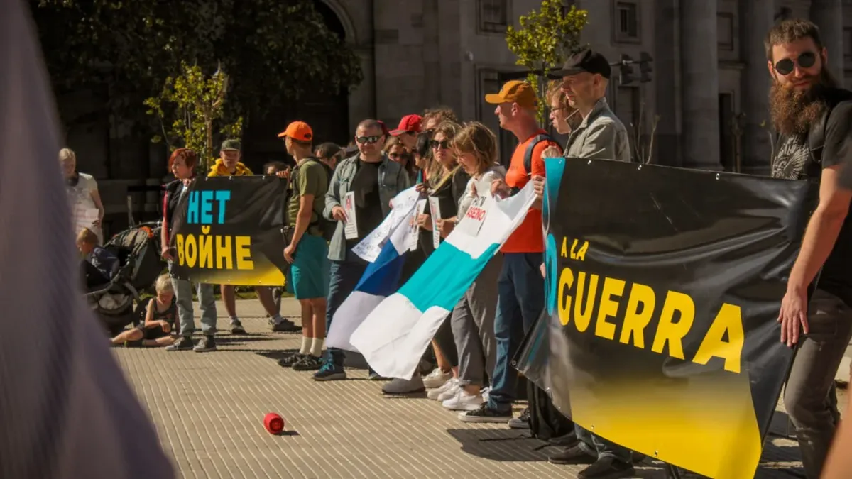 — Putin — asеsino! Путин — хуйло! — громко скандируют от силы полтора десятка активистов, стоя на обочине одной из центральных улиц Буэнос-Айреса. В руках у них украинские и бело-сине-белые флаги, а также большая растяжка с надписью «No a la Guerra» («Нет войне»).