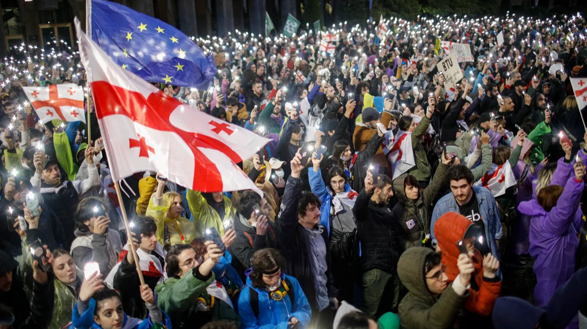 Чтобы утвердить закон «О прозрачности иностранного влияния», депутатам правящей партии пришлось въезжать в парламентский двор под плотным прикрытием полицейского спецназа. Тут же, во дворе парламента, полиция собирала задержанных: по данным МВД, 14 мая по обвинению в административных правонарушениях были задержаны 13 человек.