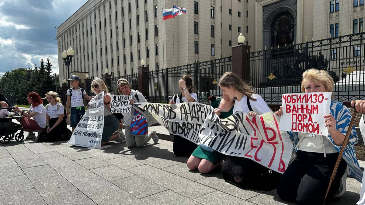 3 июня у главного здания Минобороны в Москве прошла очередная акция жен мобилизованных. Дюжина женщин с детьми и плакатами выстроилась у монументального сооружения на Фрунзенской набережной, потребовав встречи с новым министром обороны Андреем Белоусовым. В итоге встреча так и не состоялась, а вместо Белоусова к протестующими вышел генерал-полковник Александр Борисенко, который обвинил их в «раскачивании лодочки в интересах оппозиционных телеграм-каналов». Следом прикатился автозак. Полицейские предупредили о незаконности акции и пригрозили задержаниями. В ответ собравшиеся встали на колени и заявили, что никуда не уйдут. Автозак уехал. Позднее одна из участниц акции, Мария Семёнова, так описала случившееся в своем телеграм-канале: