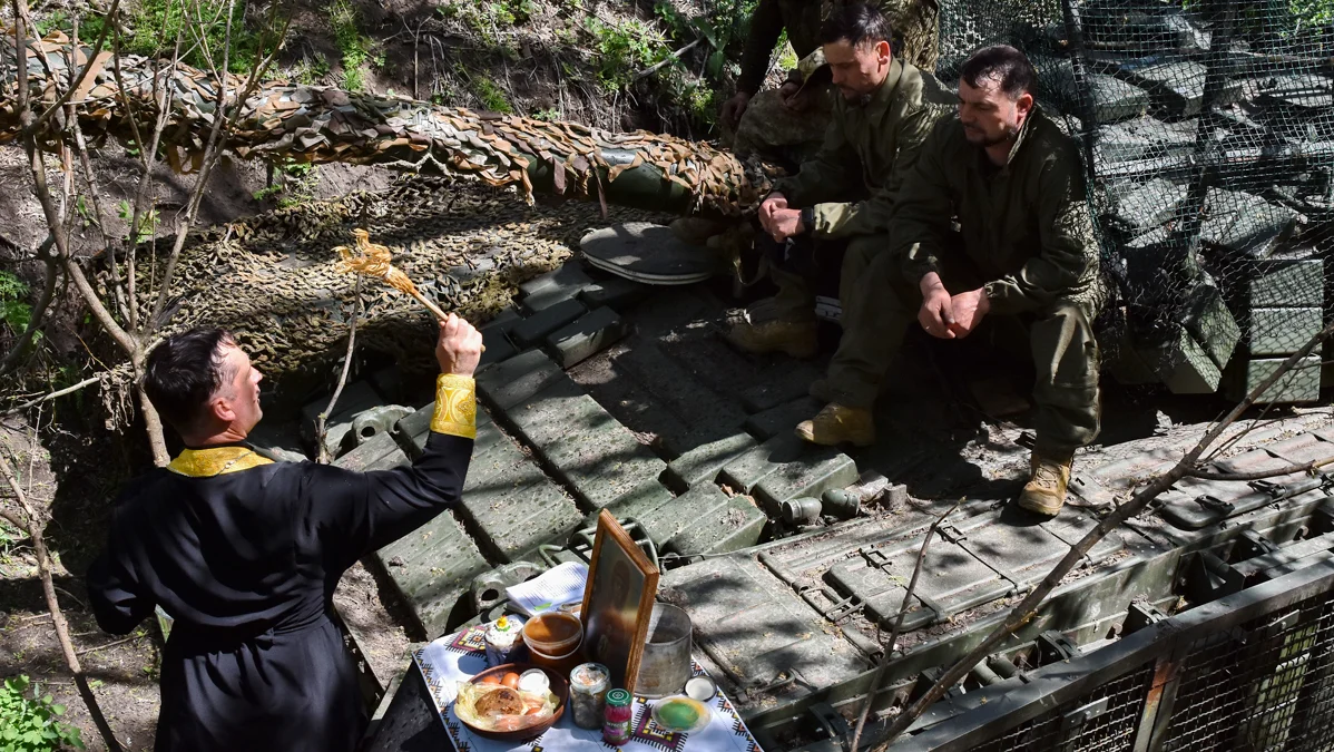 Военный капеллан Сергей проводит службу возле танка и его экипажа во время празднования Пасхи вблизи линии фронта в Запорожской области, Украина, 20 апреля 2025 года. Фото: пресс-служба 65-й отдельной механизированной бригады ВСУ / EPA