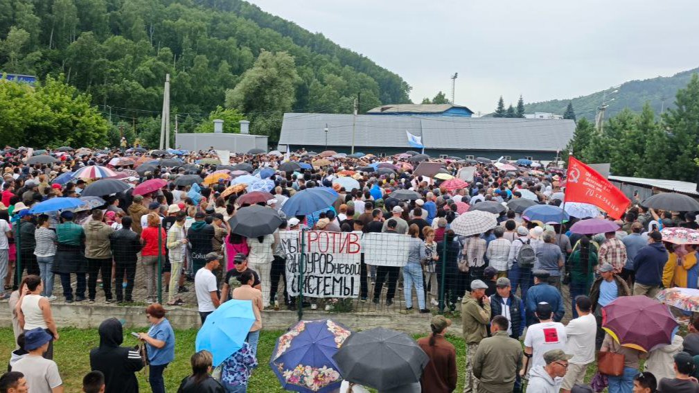Люди держат плакаты «[губернатора Андрея] Турчака в отставку, одноуровневой власти — нет», «Мы против оккупации наших земель олигархами», «Баатыры Чике-Тамана — герои Алтая» (Чике-Таман — перевал, где жители перекрыли дорогу, протестуя против муниципальной реформы, семерых из них арестовали на 13-14 суток, отмечает 7x7).