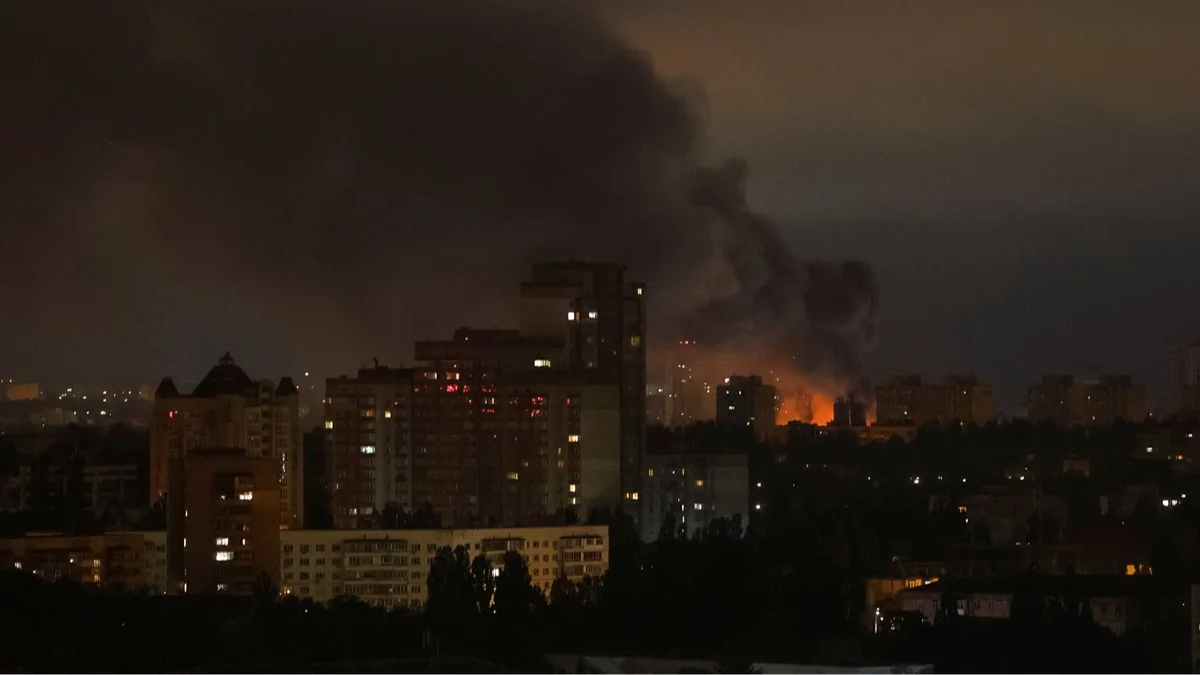 Дым и огонь после удара российского беспилотника по Киеву, Украина, 30 июля 2025 года. Фото: Gleb Garanich / Reuters / Scanpix / LETA