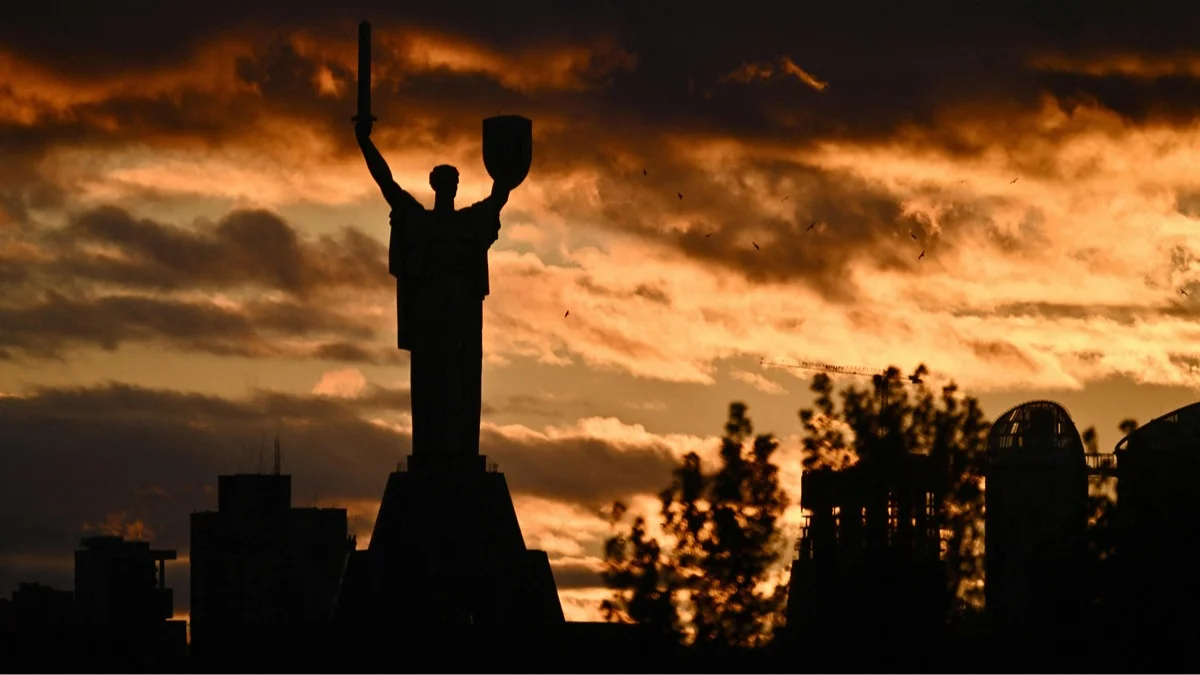 Монумент «Родина-мать» на фоне облачного неба на закате в Киеве, Украина, 28 октября 2023 года. Фото: Genya Savilov / AFP / Scanpix / LETA
