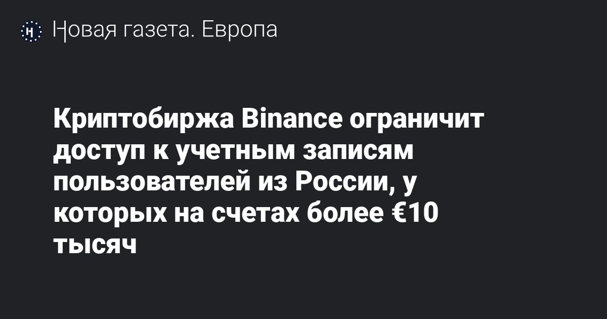 Крупнейшая криптобиржа мира Binance ограничит доступ к учетным записям пользователей из России, у которых на счетах есть активы общей стоимостью более €10 тысяч. Об этом сообщает РБК со ссылкой на сообщение в чате биржи. Скриншот сообщения биржи также опубликовали в телеграм-канале «нью крипто щит».
