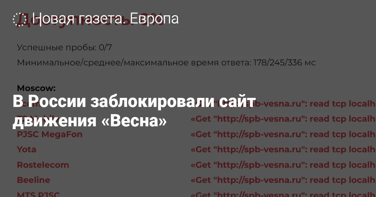 В России заблокировали сайт движения «Весна», сообщают представители организации в телеграм-канале. Это подтверждает и сервис GlobalCheck, согласно которому доступность сайта — 0%.