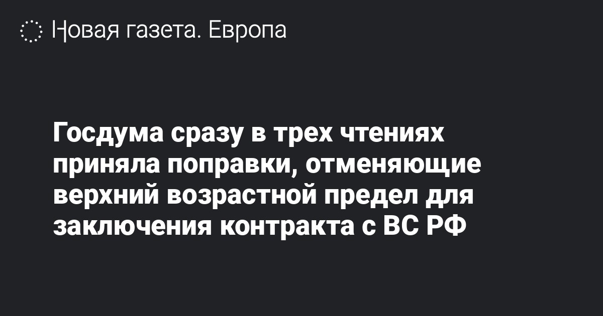 Государственная дума РФ приняла сразу в трех чтениях поправки к закону «О воинской обязанности и военной службе», которые отменяют верхний возрастной предел для заключения контракта с Вооруженными силами РФ. Текст закона опубликован на сайте парламента.