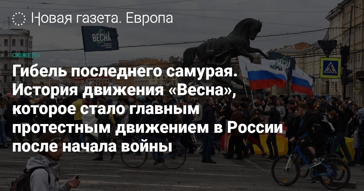 «Останься я в России, то я бы тоже с ребятами делал антивоенное движение. — говорит давно эмигрировавший активист «Весны» Дьяконов. — Я горжусь, что был в одном движении с ребятами, которые, несмотря на все риски, остались в авангарде [протестного движения], когда никто за ними не стоял — ни массовая уличная поддержка, ни лидеры общественного мнения. »Весна« — это такой последний самурай, который сражается без надежды на победу».