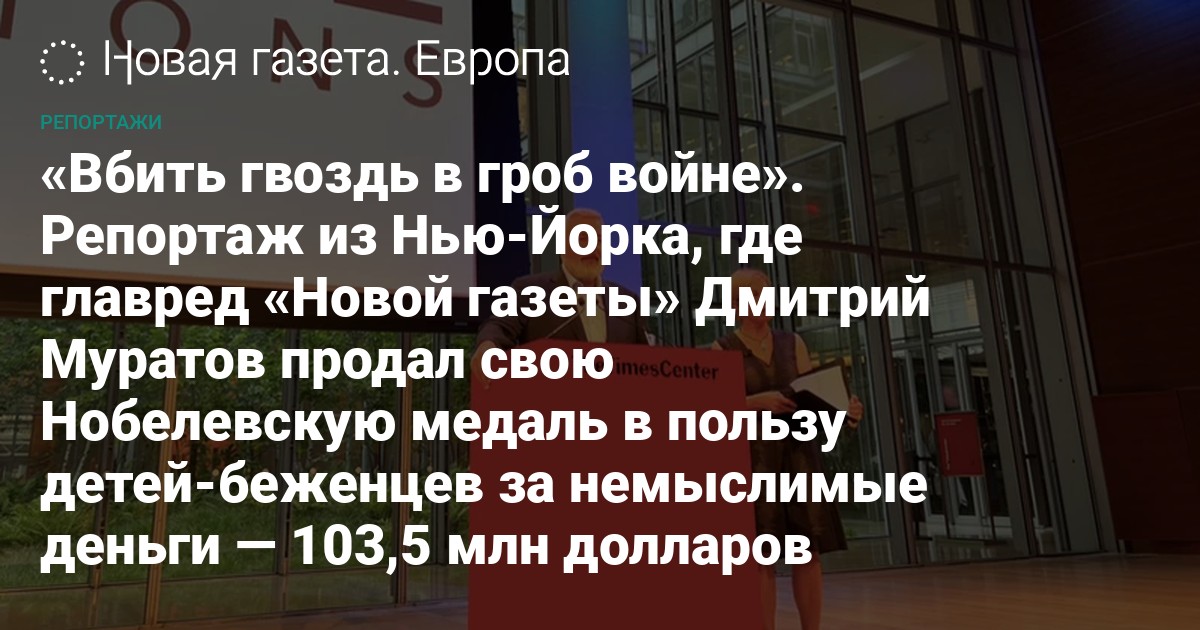 — Как сказал Альфред Нобель, Нобелевской премией мира награждаются те, кто внес наибольший вклад в развитие человечества, — продолжает Джош Бенеш, стратегический директор аукционного дома. — Журналистский труд Дмитрия Муратова — это воплощение этой цитаты. Но то, что происходит сегодня, выходит за рамки даже этой оценки.