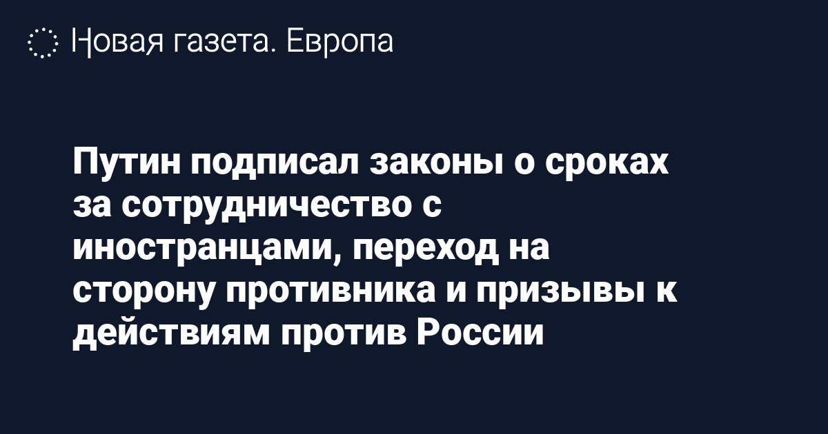 Документ также вводит уголовную статью 280.4 «Публичные призывы к осуществлению деятельности, направленной против безопасности государства». За это россиянам грозит штраф от 100 тысяч до 500 тысяч рублей или от 2 до 4 лет колонии, если «преступление» совершено группой или с угрозой насилия — от 5 до 7 лет колонии со штрафом от 500 тысяч до 2,5 млн рублей.