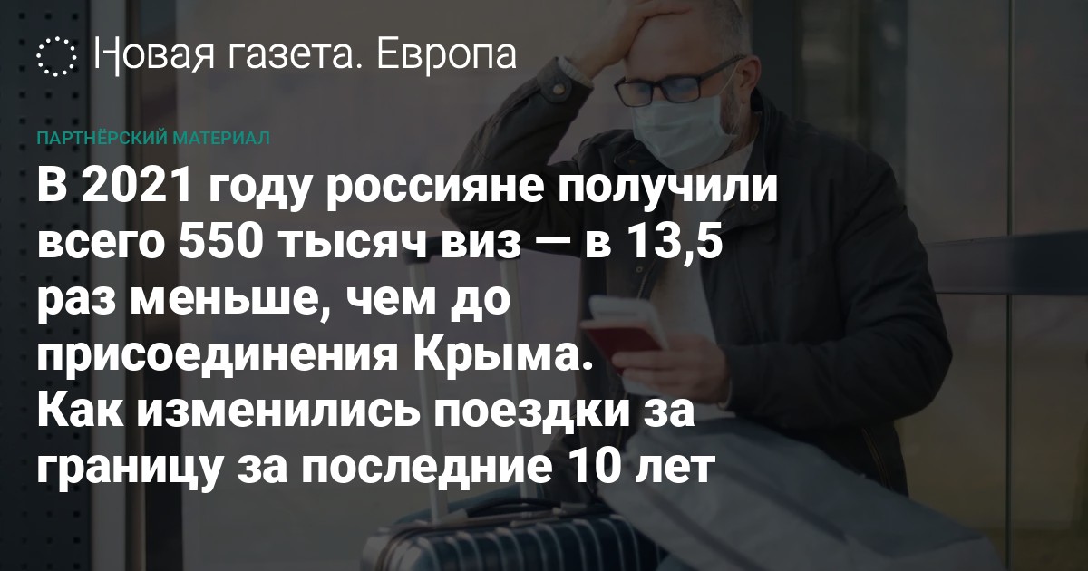 По данным Европейской комиссии, с 2012 по 2014 год россияне получали в среднем 5-7 млн краткосрочных шенгенских виз (категории С) в год, еще около 500 тыс неиммигрантских виз в США, Великобританию и Канаду. После присоединения Крыма выдача виз упала на 35-40%, до 2020 года россияне получали по 3-4 млн шенгенских и 200-300 тыс. виз от США, Великобритании и Канады. Тенденция сохранялась до 2016 года, после чего количество выданных виз снова превысило 4 млн в год и продержалось на этом уровне до начала пандемии. Уже к 2021 году объем выдачи снизился на 88% по сравнению с доковидным уровнем — до 555 тыс. въездных документов. Больше всего виз в прошлом году выдали Греция (172 тыс.), Испания (67 тыс.) и Италия (64 тыс.), отказывали чаще Германия, Мальта и Бельгия.