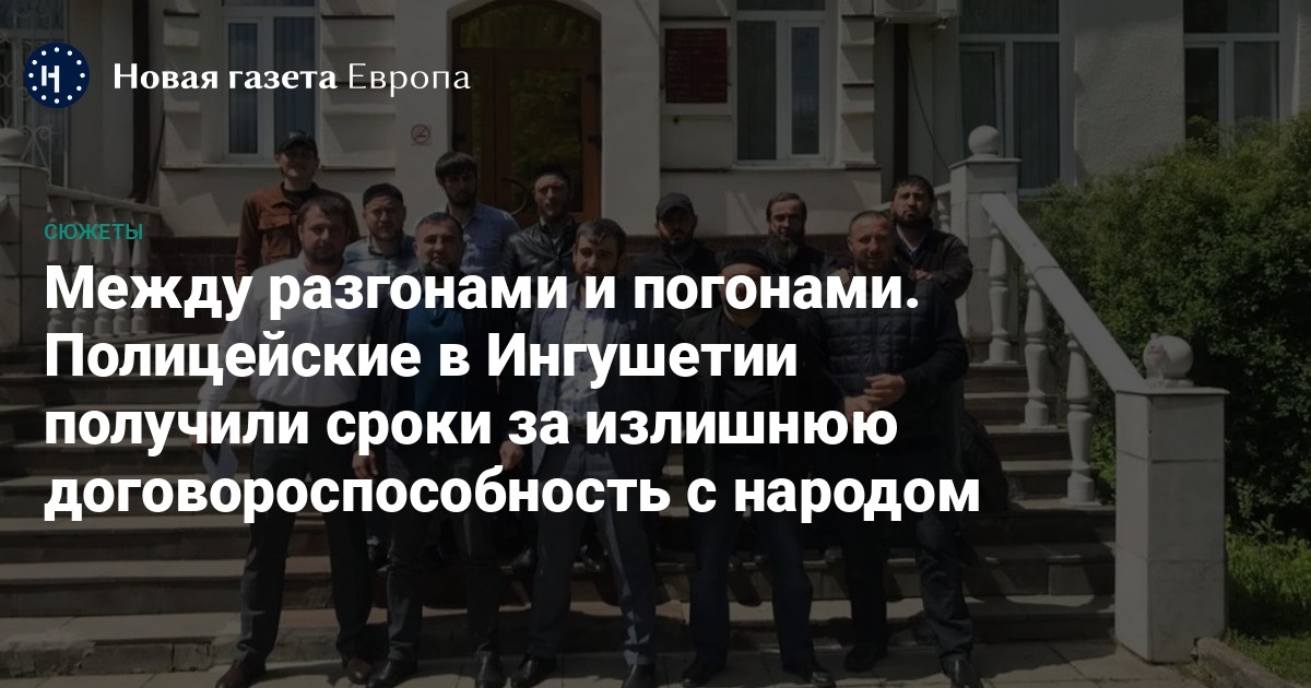 Железноводский городской суд Ставропольского края 30 августа вынес решение по делу 12 бывших полицейских из Ингушетии, которые обвинялись в неисполнении приказа. Суть преступления ингушских полицейских, по мнению следствия, заключалась в том, что они встали шеренгой между протестующими и сотрудниками Росгвардии, прикомандированными в Ингушетию, на одном из митингов в республике. Вместо того чтобы разгонять митинг, полицейские просто развели оппонентов в разные стороны.
