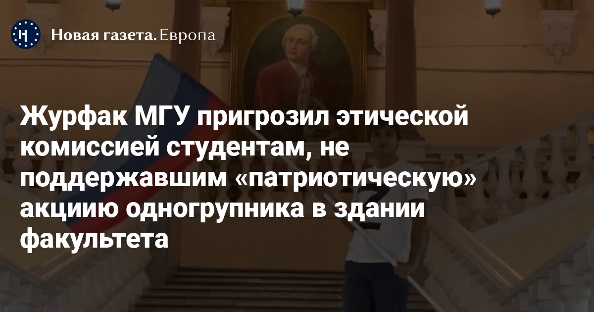 На факультете журналистики МГУ заявили, что негативная реакция студентов факультета журналистики на «патриотическую» акцию учащегося третьего курса Степана Антропова будет рассматриваться на Этической комиссии факультета. Об этом сообщается на странице журфака «ВКонтакте».