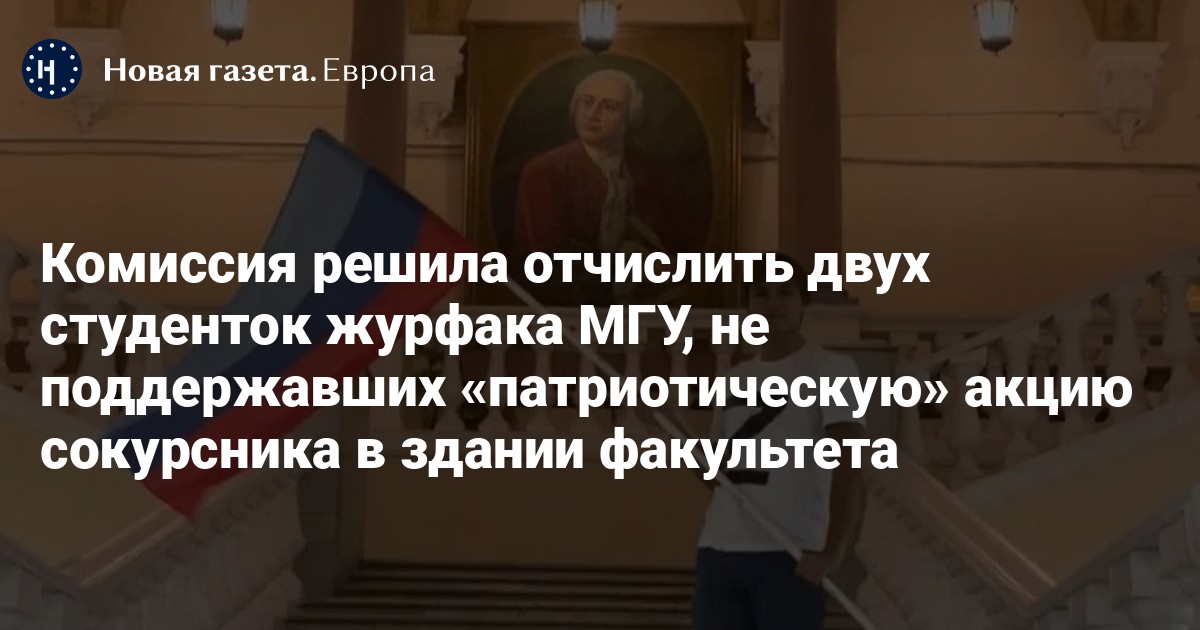 Комиссия по студенческим делам факультета журналистики МГУ приняла решение отчислить двух студенток, которые осудили «патриотическую» акцию учащегося 3 курса Степана Антропова. Сами заявления об отчислении еще не подписаны, рассказали «Новой газете. Европа» учащиеся вуза.
