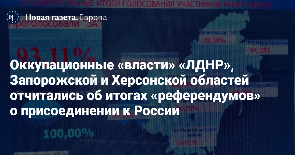 Оккупационные «власти» самопровозглашенных «ДНР», «ЛНР», а также Запорожской и Херсонской областей отчитались об итогах «референдумов» о присоединении к России.
