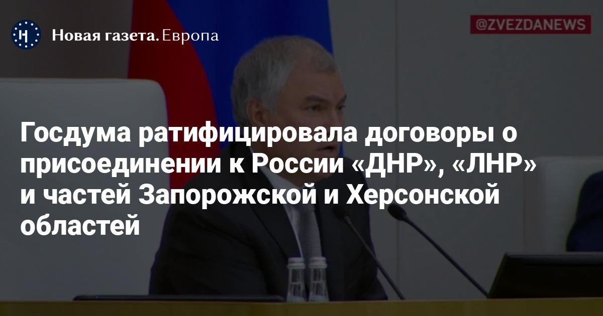 Госдума ратифицировала договоры о присоединении к России «ДНР» и «ЛНР», а также частей Запорожской и Херсонской областей.