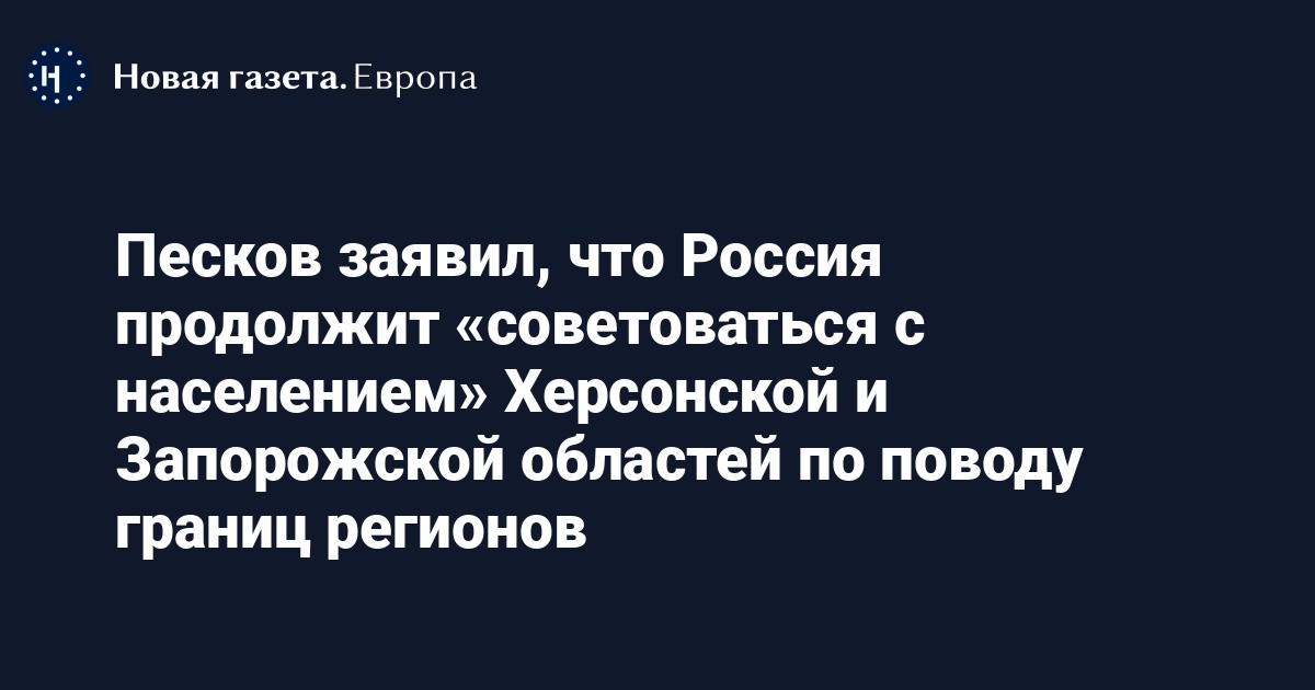 Песков заявил, что Россия продолжит «советоваться с населением» Херсонской и Запорожской областей по поводу границ регионов