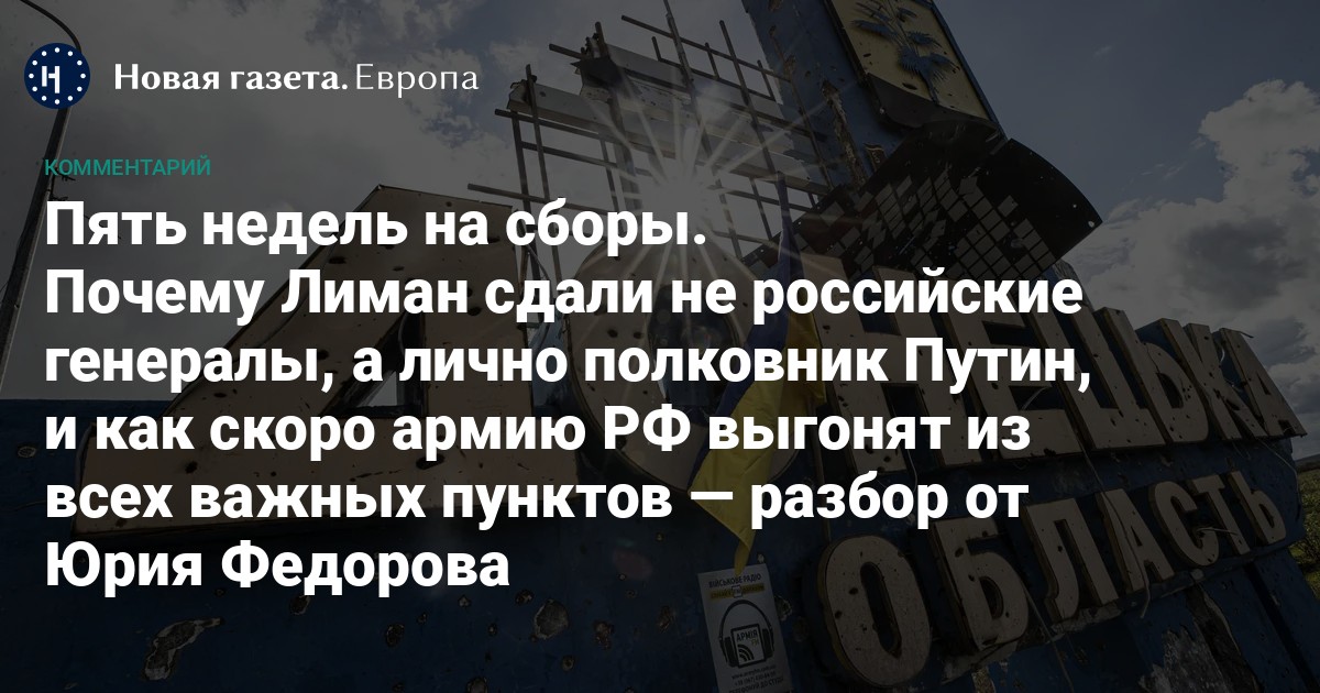 «С точки зрения военного я не могу объяснить сдачу Лимана. Это не скоротечный бой был. Мне непонятно, почему за всё время не оценили правильно обстановку, не усилили группировку. Проблема в повальном вранье, докладе «хорошей обстановки». Эта система идёт сверху вниз».