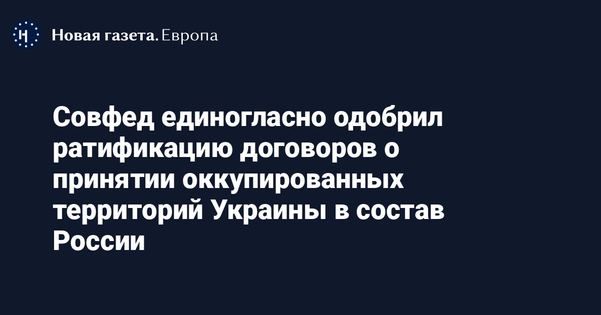 Совет федерации единогласно одобрил ратификацию договоров о принятии самопровозглашенных «ЛНР», «ДНР», а также оккупированных Россией частей Запорожской и Херсонской областей в состав РФ. Об этом сообщает ТАСС со ссылкой на заседание Совфеда.