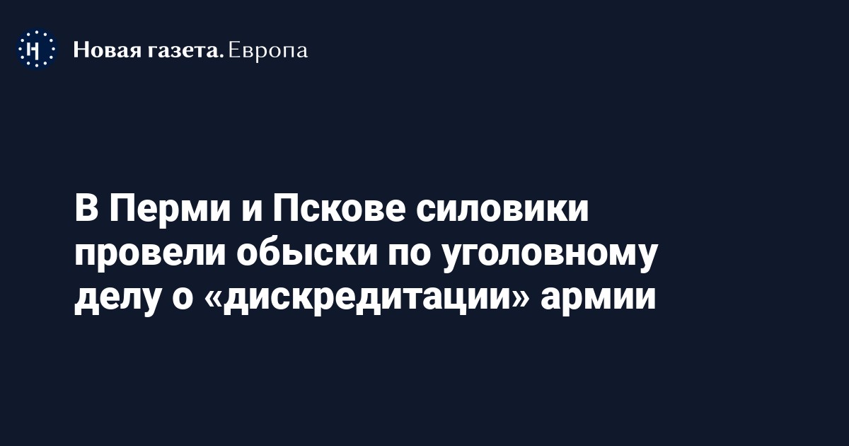 Силовики пришли с обысками со ссылкой на одно и то же уголовное дело о повторной «дискредитации» армии (ст. 280.3 УК) к депутату Завеличенской волости от партии Яблоко Николаю Кузьмину в Пскове и признанному иноагентом политологу Виталию Ковину в Перми. Об этом сообщает телеграм-канал «Сетевые свободы».