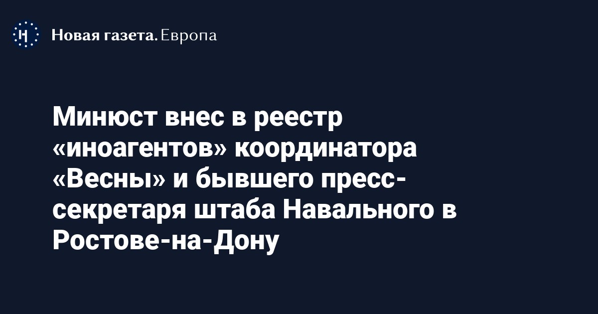 Минюст внес в список физлиц-«иноагентов» координатора движения «Весна» Богдана Литвина и бывшего пресс-секретаря штаба Навального в Ростове-на-Дону и активиста Тимофея Мартыненко. Список опубликован на сайте ведомства.