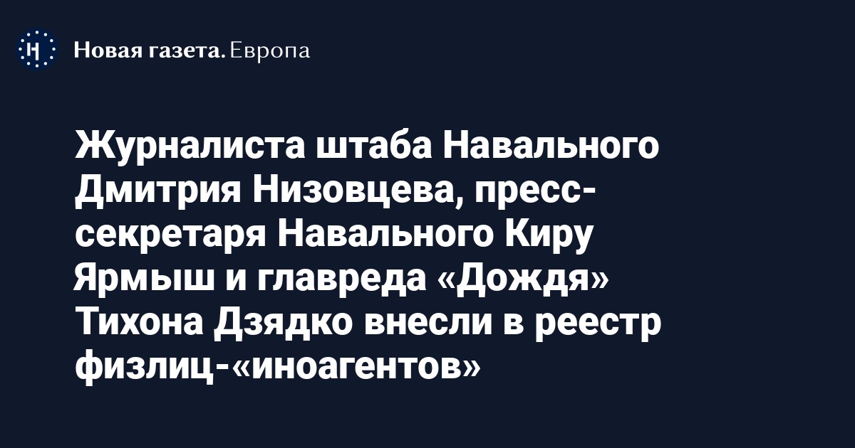 Журналиста штаба Навального Дмитрия Низовцева, пресс-секретаря Навального Киру Ярмыш и главреда телеканала «Дождь» Тихона Дзядко внесли в реестр физлиц-«иноагентов».