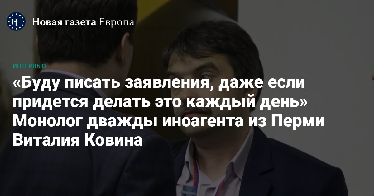 В прошлую пятницу Минюст снова пополнил реестры иностранных агентов. В них, помимо известных людей, попал и один из координаторов движения наблюдателей «Голос» — пермский политолог Виталий Ковин. Он стал первым человеком, которого внесли в реестр иноагентов дважды: сначала в реестр СМИ, а затем, когда он смог добиться исключения оттуда, в реестр физлиц-иноагентов. «Новая газета Европа» поговорила с политологом о том, как ему удалось доказать Минюсту, что он не СМИ-иноагент, и что он думает о своем повторном включении.