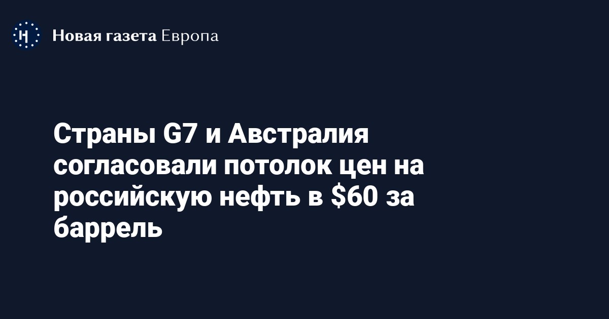 Страны G7 (Германия, Италия, Франция, Великобритания, Канада, Япония и США) и Австралия согласовали введение потолка цен на российскую нефть на уровне 60 долларов за баррель. Соответствующее заявление «Коалиции по ограничению цен» было опубликовано на сайте Министерства финансов США.