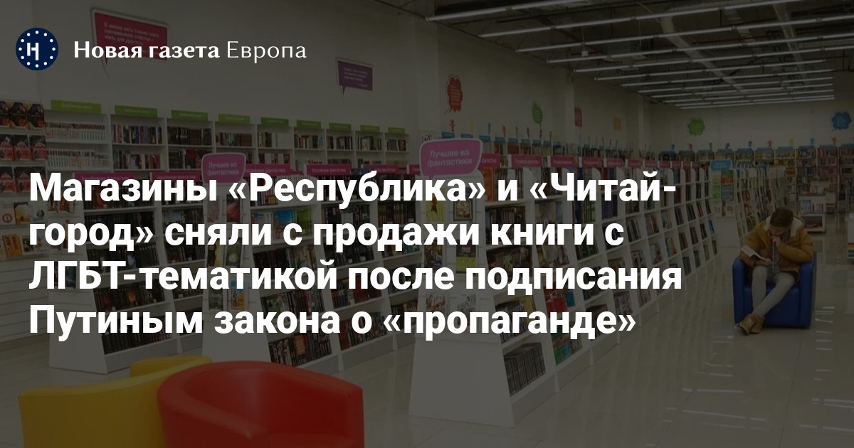 Книжные магазины «Республика» и «Читай-город» сняли с продажи некоторые произведения, в которых изображаются «нетрадиционные отношения», после того, как президент России Владимир Путин подписал указ о запрете ЛГБТ-«пропаганды». Об этом корреспонденту «Новой газеты Европа» рассказали сотрудники торговых точек.