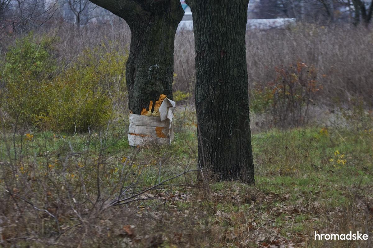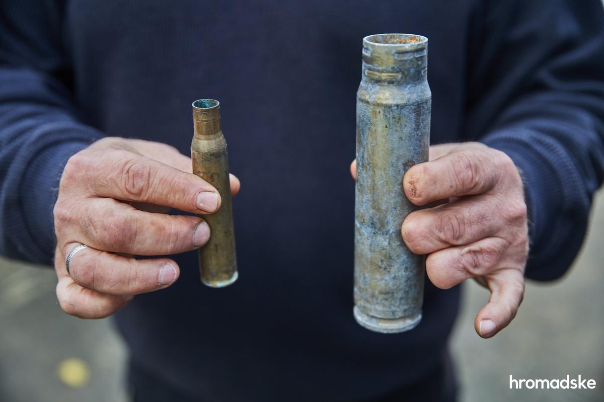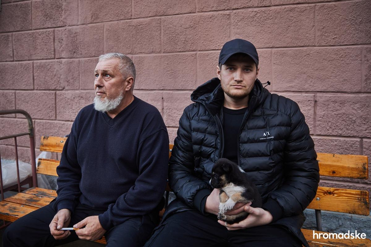 Андрей Бакун держит на руках щенка по кличке Байрактар, сидя рядом со своим отцом Валерием, который также помогал собирать тела погибших терробороновцев. На втором фото Валерий Бакун показывает гильзы от крупнокалиберного оружия, найденные в Сиреневом парке. Фото: Александр Хоменко / hromadske
