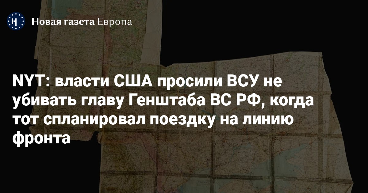 Власти США просили Вооруженные силы Украины не убивать начальника Генштаба ВС РФ генерала Валерия Герасимова, когда он тайно спланировал поездку на линию фронта в конце апреля. Об этом говорится в новом расследовании The New York Times о провалах России в ходе полномасштабной войны с Украиной.