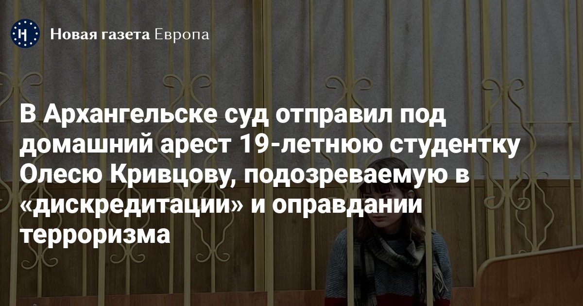 Приморский районный суд Архангельской области отправил под домашний арест до 25 февраля 19-летнюю студентку Олесю Кривцову, подозреваемую в «дискредитации» ВС РФ (ч. 1 ст. 280.3 УК) и публичном оправдании терроризма (ст. 205.2 УК). Об этом сообщает корреспондент «Новой газеты Европа» Татьяна Брицкая.