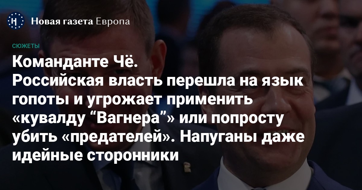«Там на просторах интернетов/телеграмов возобновилась дискуссия о том, как быть с предателями, переметнувшимися к врагу и желающими гибели своему Отечеству. В том числе с некоторыми ничтожными ошметками дерьма, которые еще недавно причисляли себя к так называемой интеллектуальной элите. <…> …если закон не работает или не достигает цели, то по особым правилам военного времени. Вспомним опыт Великой Отечественной, да и других стран. Во времена войн всегда были такие специальные правила. И тихие группы безукоризненно незаметных людей, их результативно исполняющие». Об этом в своем телеграм-канале, после того как отпраздновал Рождество, рассуждал бывший президент Дмитрий Медведев, предлагая во время войны в Украине «действовать с предателями не по закону, а по справедливости».