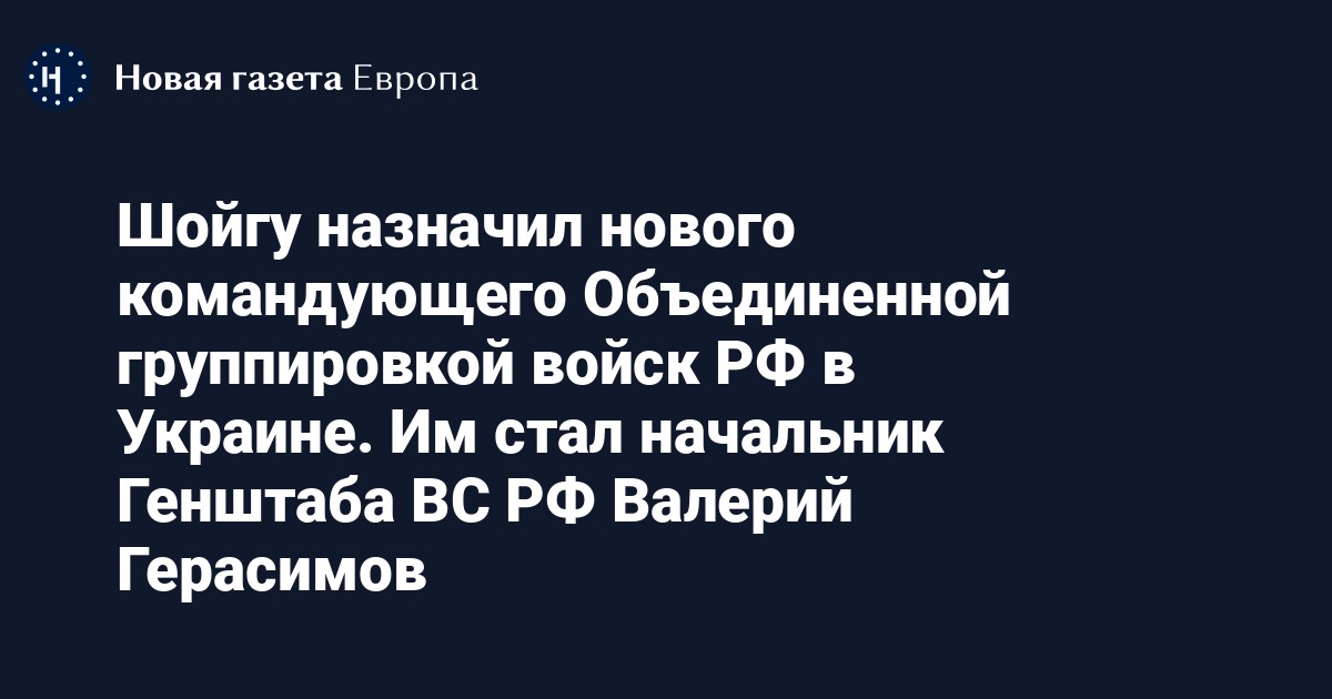 Министр обороны РФ Сергей Шойгу назначил нового командующего Объединенной группировкой войск РФ в Украине. Им стал генерал армии, начальник Генерального штаба Вооруженных сил РФ Валерий Герасимов. Об этом сообщает ТАСС со ссылкой на ведомство.