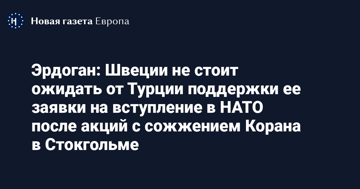 Швеции не стоит ожидать от Турции поддержки ее заявки на вступление в НАТО после акций у турецкого посольства в Стокгольме, во время которых сжигали Коран, заявил президент Реджеп Тайип Эрдоган.