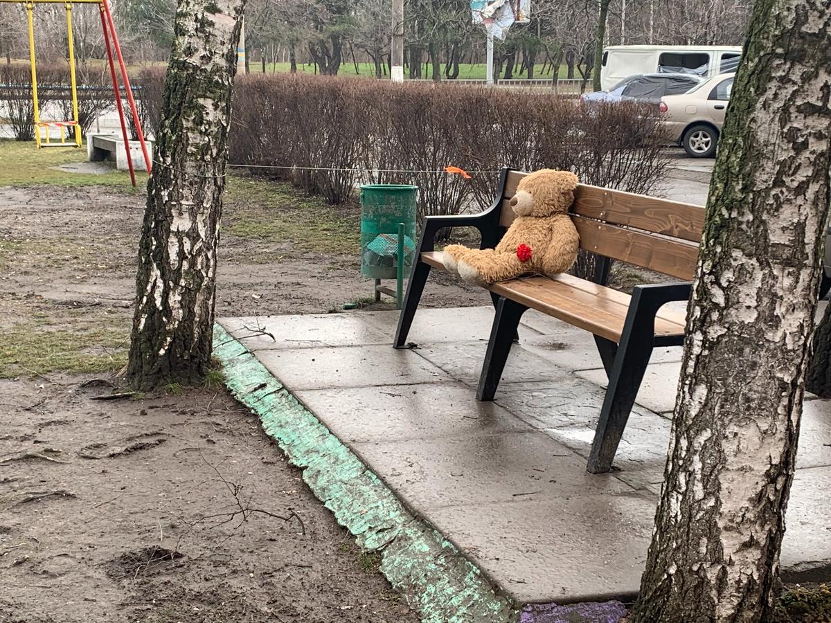 Игрушечный медведь мокнет на лавке под дождем. Рядом с ним женщина в ярком, великоватом для нее комбинезоне и куртке без капюшона. Видит меня, чужую. Жестом показывает: «Нет! Не приближайся!» У тех, кто потерял близких, наступил этап, когда горе уже внутри и больше не требует крика и пересказа по многу раз, как это было.