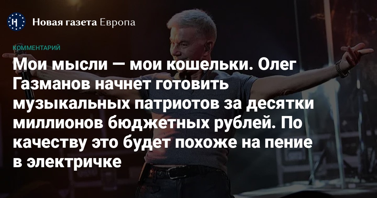 Дележ пропагандистского бюджета в разгаре. После майского Z-тура с поражающими воображение гонорарами (93,5 миллиона рублей; Газманову, пишут СМИ, досталось из них сравнительно немного — скромные 2,4 миллиона) Олег Михайлович анонсировал Конкурс патриотической песни «Родники» стоимостью 19 миллионов, увы, тоже рублей. Основной инвестор — Президентский фонд культурных инициатив (он выделил 17 млн).