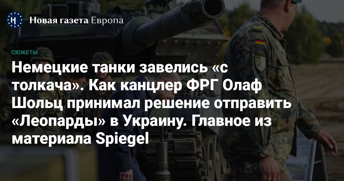 На прошлой неделе канцлер Германии объявил о планах передать Киеву не менее 112 боевых танков Leopard 2 совместно со странами-союзницами. Тогда же стало известно, что Пентагон, похоже, поставит Украине передовые танки Abrams. До этого украинские и западные политики обвинили Германию в умышленной отсрочке поставок вооружений, необходимых на поле боя в преддверии предполагаемого нового российского наступления. Немецкое издание Der Spiegel рассказало, как глава ФРГ Олаф Шольц перешел к принятию такого решения. «Новая газета Европа» рассказывает главное из этого материала.