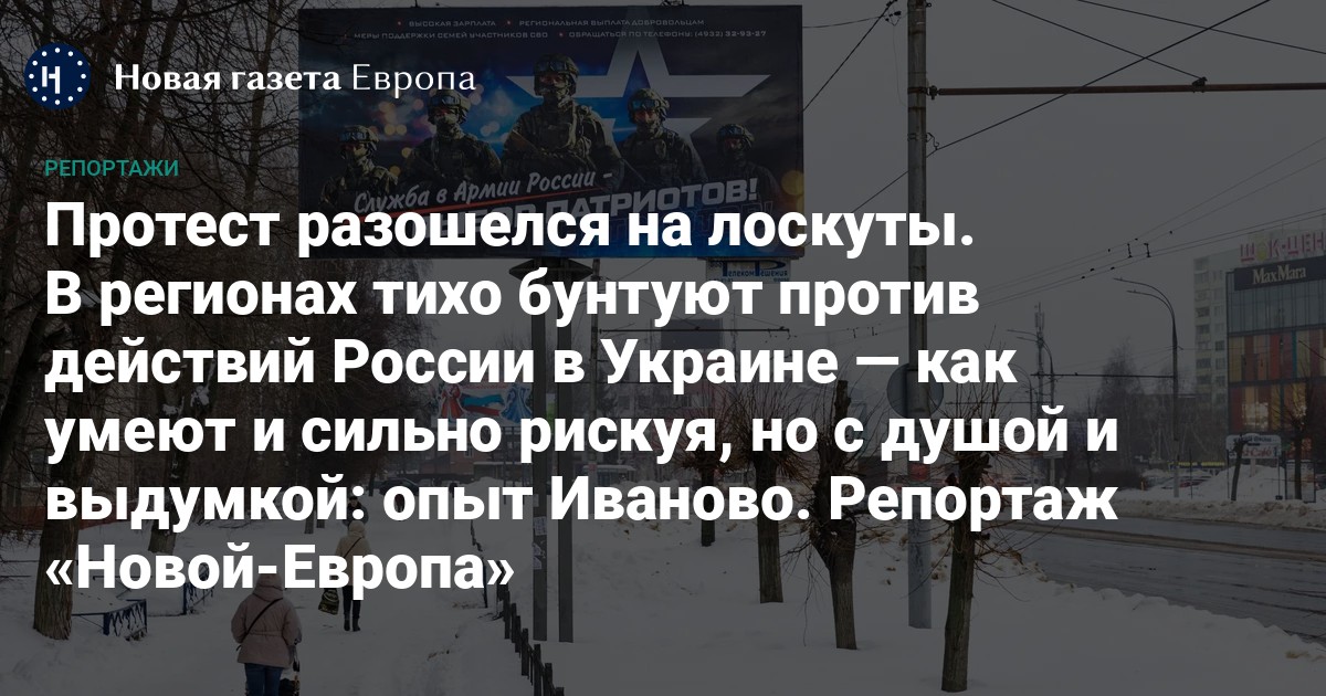 На ивановцев, безропотно преодолевающих все природные катаклизмы и нерасторопность коммунальщиков, внимательно смотрит с огромного билборда военный в маске. Ивановцы прыгают через сугробы или скользят на льду, а портрет день за днем продолжает свою молчаливую агитацию: «Zа мир! Zа правду! Zа Россию!» Другой билборд и вовсе философски призывает «побеждать зло добром». Что именно считать злом и добром, неясно, хотя по милитаристской направленности картинки догадаться можно. В остальном на улицах Иваново с Z-патриотизмом не густо, зато то и дело встречаются украдкой нанесенные надписи «Нет войне». А еще — большое количество рекламы швейных производств, которые «шьют для фронта».