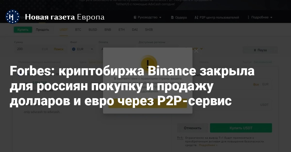 Корреспондент «Новой газеты Европа» убедился, что Binance запрещает, в частности, покупать USDT за евро, теперь можно только за рубли.