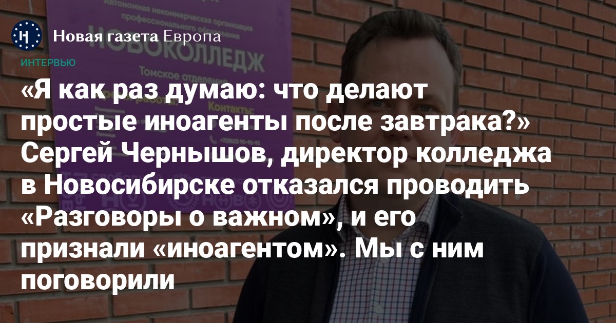 Среди «иностранных агентов», получивших этот статус в пятницу 26 мая, оказался новосибирский историк и предприниматель, учредитель частного «Новоколледжа» Сергей Чернышов. Месяц назад в его колледж пришла проверка. Результатом стали три предписания районного прокурора, выявившего нарушения по части антитеррористической подготовки здания, неправильных адресов, где ведется преподавание, и недостоверной информации о госаккредитации, которую колледж якобы давал абитуриентам. По образованию (одному из трех) Чернышов — историк, статус иноагента по российскому законодательству лишает его права преподавать. Как он будет «нести звание», Сергей Чернышов рассказал «Новой-Европа».
