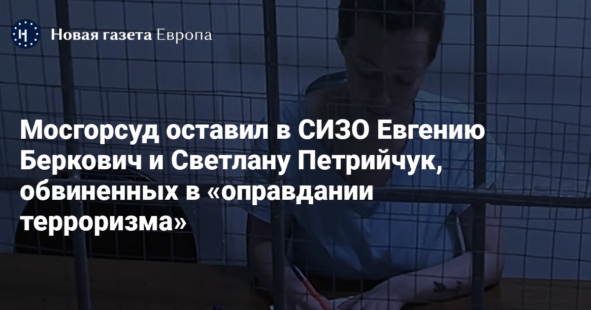 Московский городской суд оставил в СИЗО режиссерку Евгению Беркович, арестованную по обвинению в «оправдании терроризма» из-за спектакля «Финист Ясный Сокол», сообщает корреспондент «Новой газеты Европа» из зала суда.