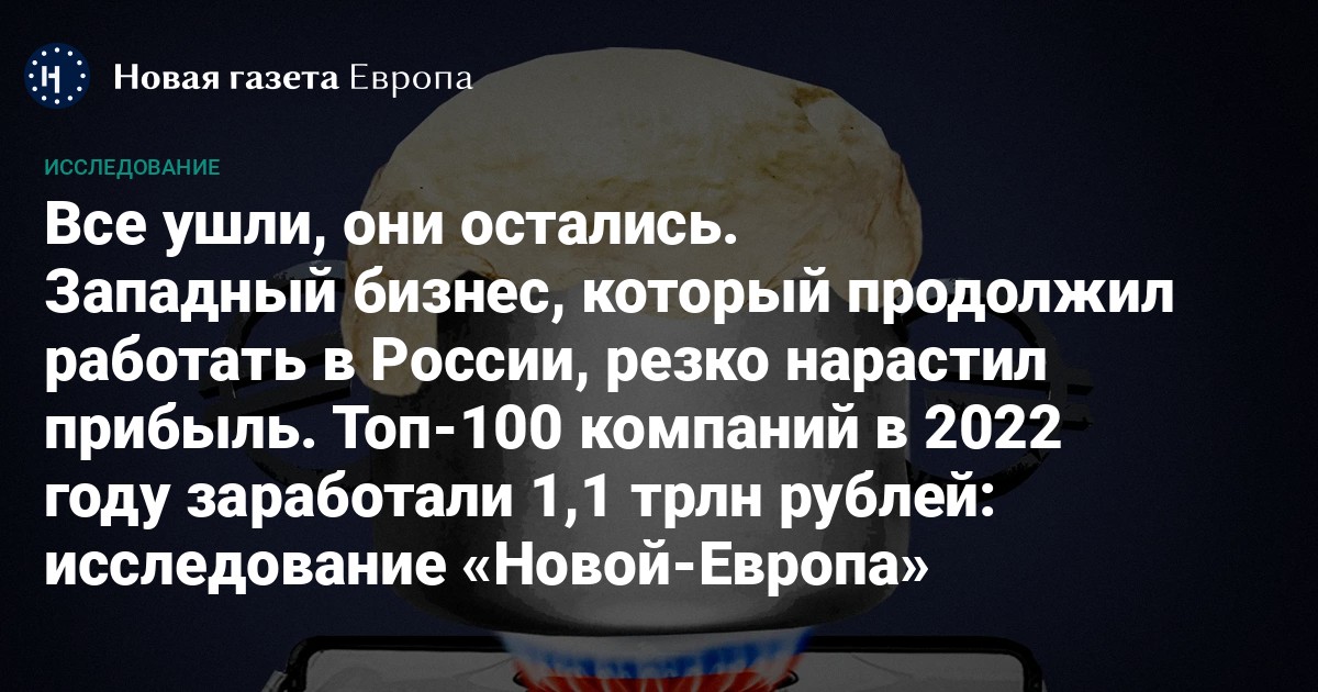 Вскоре после начала войны крупнейшие иностранные компании стали массово объявлять об уходе из России. Но оказалось, что уйти не так-то легко. Одним пришлось вынужденно задержаться в стране в ожидании покупателей, а другие просто решили продолжить работать как ни в чем не бывало. В результате «недружественный» бизнес, который не ушел из России, в 2022 году увеличил прибыль в полтора раза — до 1,1 трлн рублей, подсчитала «Новая-Европа». Рассказываем, как Total, Raiffeisen, PepsiCo и десятки других западных компаний получают сверхдоходы в России во время войны — и платят с них налоги в бюджет.