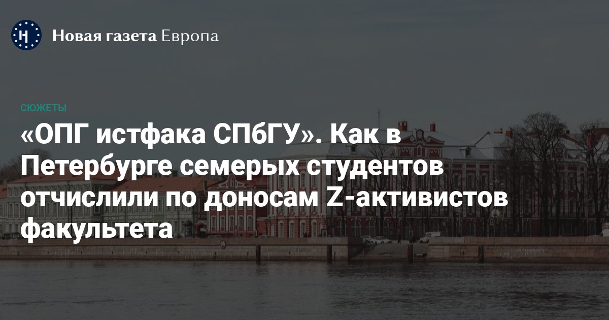 Из Санкт-Петербургского государственного университета (СПбГУ) отчислили без права на восстановление семерых студентов-историков, которые высказывались против войны в Украине. Поводом стали посты в Z-пабликах, где говорилось о существовании «ОПГ истфака», или «ячейки вырусей-русофобов». Провластные блогеры заявляли, что учащиеся вместе с доцентом Михаилом Белоусовым «глумились» над смертью Фёдора Соломонова — второкурсника истфака СПбГУ, который добровольно отправился воевать. «Новая газета Европа» поговорила с отчисленными студентами.