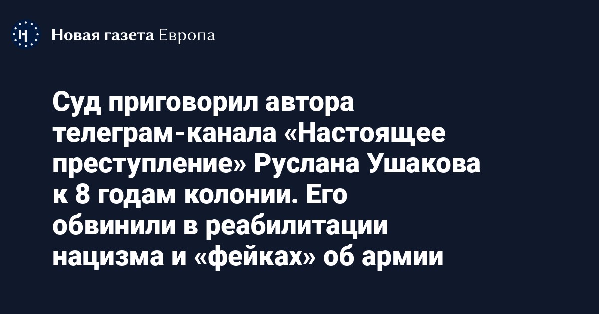Второй Западный окружной военный суд приговорил к 8 годам колонии общего режима автора телеграм-канала «Настоящее преступление» Руслана Ушакова. Об этом сообщает SOTA.
