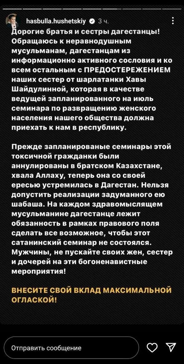 «Почему в Дагестан надо пускать такие заблудшие души?» «Только бойкот, чтобы больше они к нам не совались!» «Предостерегаем наших сестер от шарлатанки Хавы Шайдуллиной, которая в качестве ведущей запланированного на июль семинара по развращению женского населения нашего общества должна приехать к нам в республику!» Так звучат самые безобидные сообщения от дагестанских блогеров, появившиеся после того, как стало известно о грядущем семинаре Хавы. Заявленная тема семинара — «Религиозные манипуляции и неверное трактование постулатов религии».