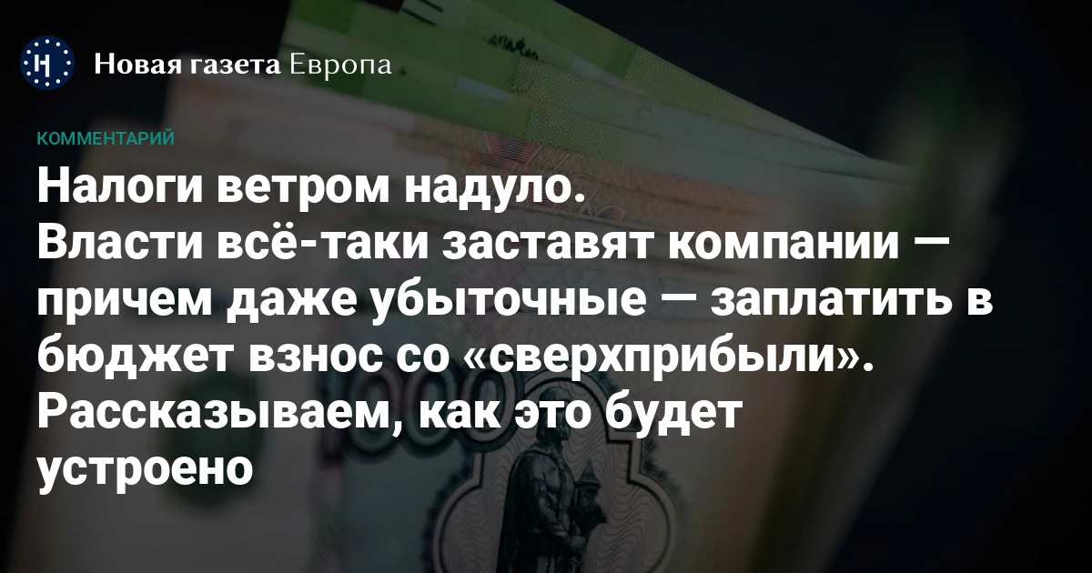 Госдума 28 июня приняла в первом чтении закон о разовом налоге на «сверхприбыль» компаний. В СМИ с начала года он обсуждался как windfall tax и «налог чрезвычайного характера». Компании должны будут заплатить 10% от суммы превышения доналоговой прибыли за 2021–2022 годы над аналогичным показателем за 2018–2019 годы.