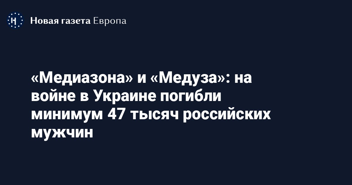 К концу мая 2023 года на войне в Украине погибли около 47 тысяч российских мужчин в возрасте до 50 лет. Об этом говорится в исследовании «Медузы» и «Медиазоны».