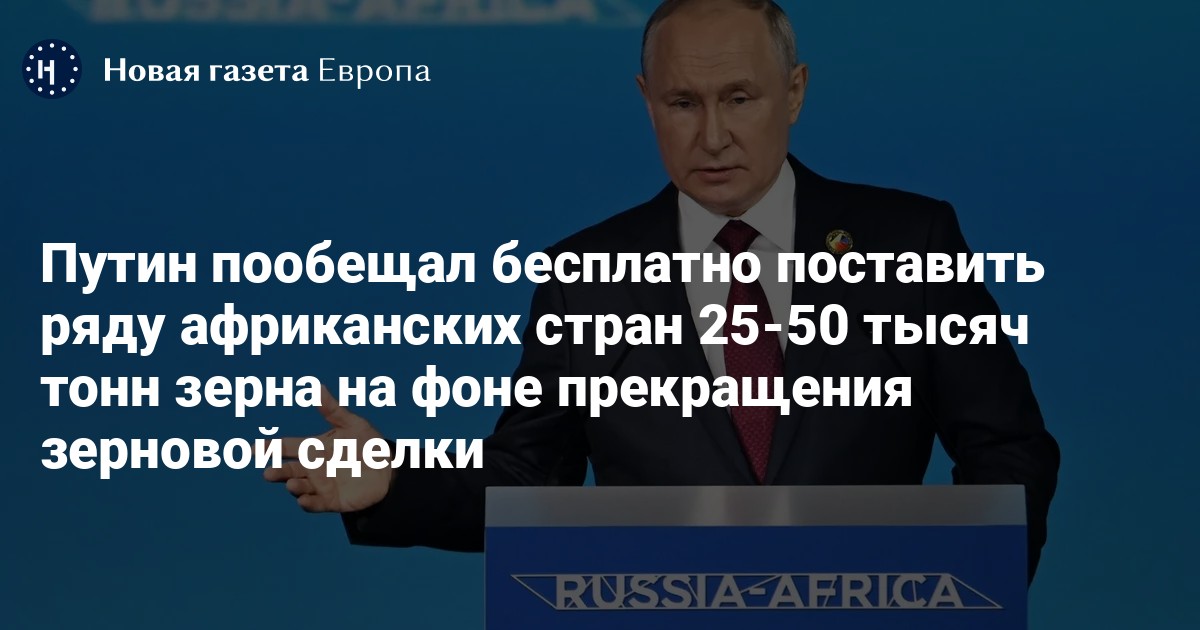 Президент России Владимир Путин пообещал в ближайшие три месяца безвозмездно предоставить по 25-50 тысяч тонн зерна Буркина-Фасо, Зимбабве, Мали, Сомали, Центральноафриканской Республике и Эритрее. Об этом он заявил в ходе пленарной сессии форума «Россия-Африка», говорится в телеграм-канале Кремля.