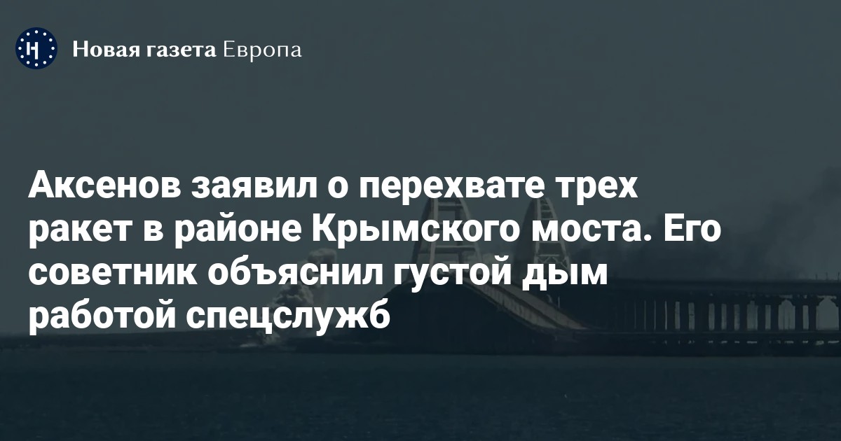 Минобороны РФ заявило, что украинская армия выпустила по Крымскому мосту «зенитную управляемую ракету С-200, переделанную в ударной вариант». Ведомство утверждает, что ракету обнаружили и перехватили в воздухе. Разрушений и пострадавших нет.